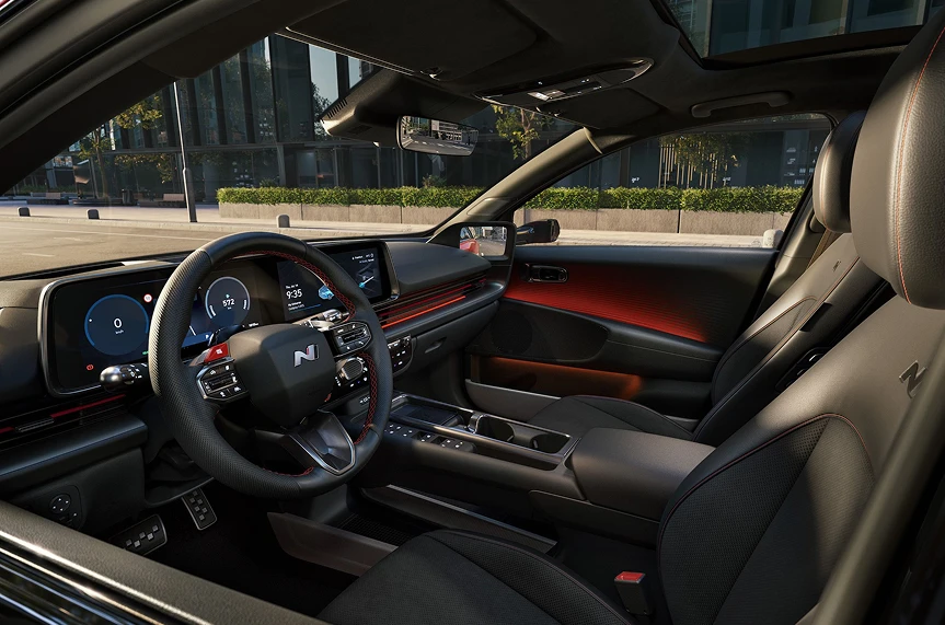 The driver-focused cockpit strikes a precise balance between comfort and sporty motorsport-inspired flair. It features sporty metal pedals, an N Line steering wheel and red accents throughout.